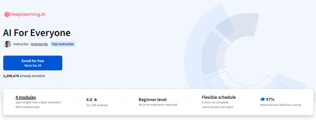 نبدأ بهذا الكورس الذي يقدمه العالم الشهير أندرو آنجي. إذ يستهدف هذا المساق فئة غير المتخصصين تقنياً، كما انه يشرح بساطة مفاهيم الذكاء الاصطناعي وتعلم الآلة. علاوة على ذلك، يوضح الكورس كيف تستخدم الشركات هذه التقنيات في استراتيجياتها، مما يجعله نقطة انطلاق مثالية لفهم التأثير الواقعي للذكاء الاصطناعي.